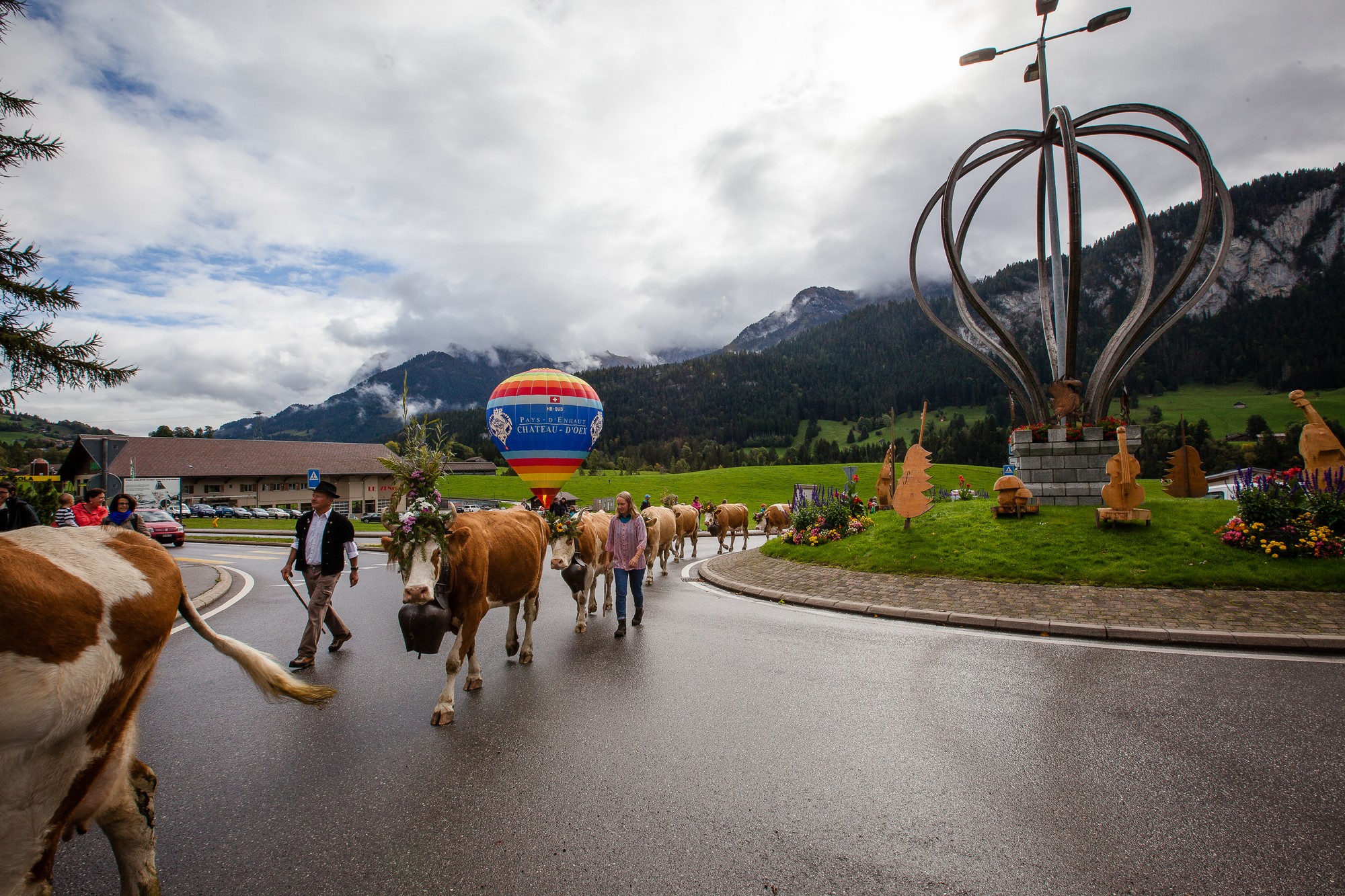 Eingang des Dorfes Château-d'Œx bilden Zuschauer und Bewohner einen Umzug und