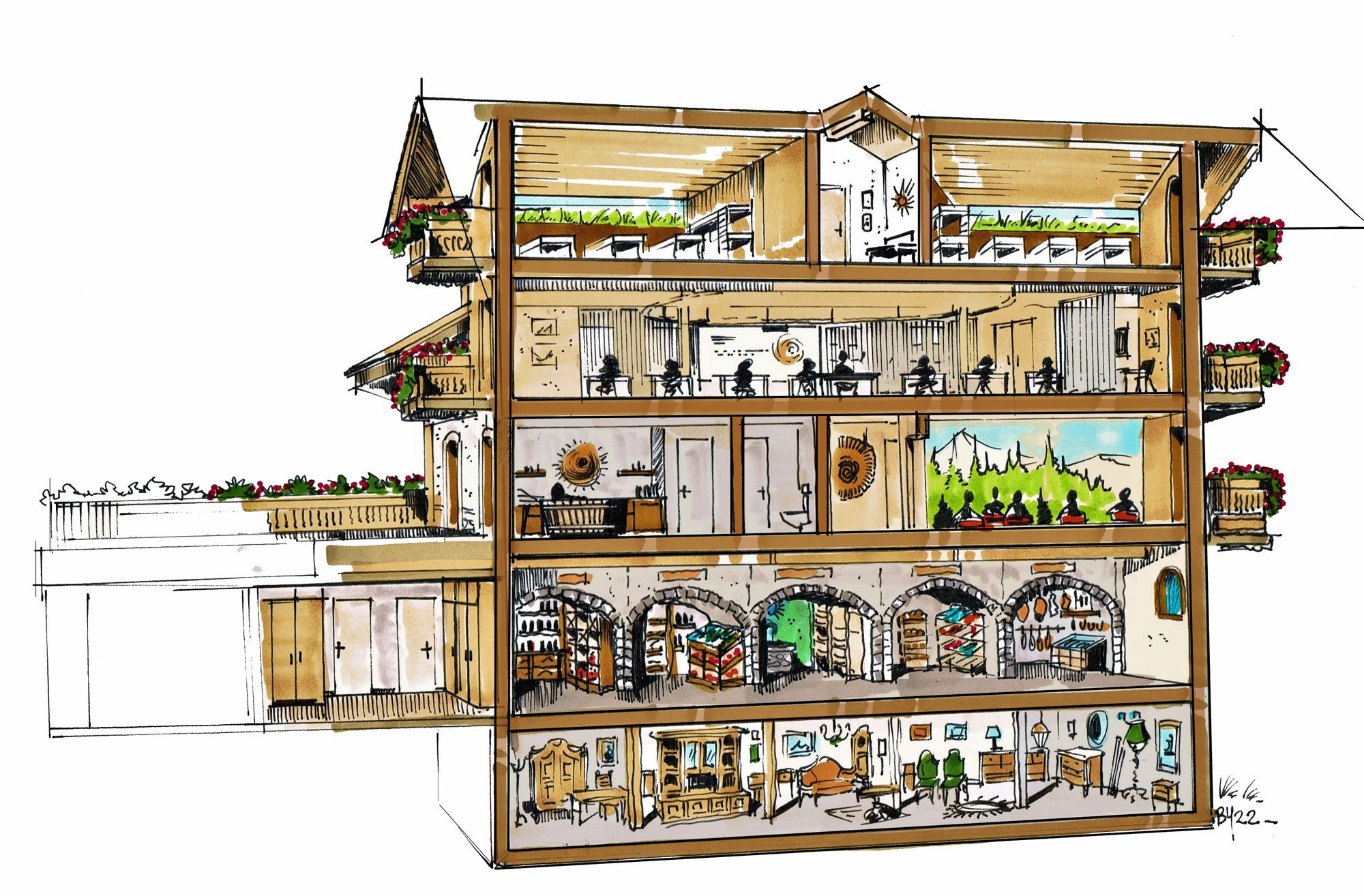 Das sechststöckige Hauptgebäude “Bovino” beherbergt: den Hof, das Restaurant, die Hotelzimmer, den Naturwellnessbereich, die Biogasanlage und die Einstellhalle.