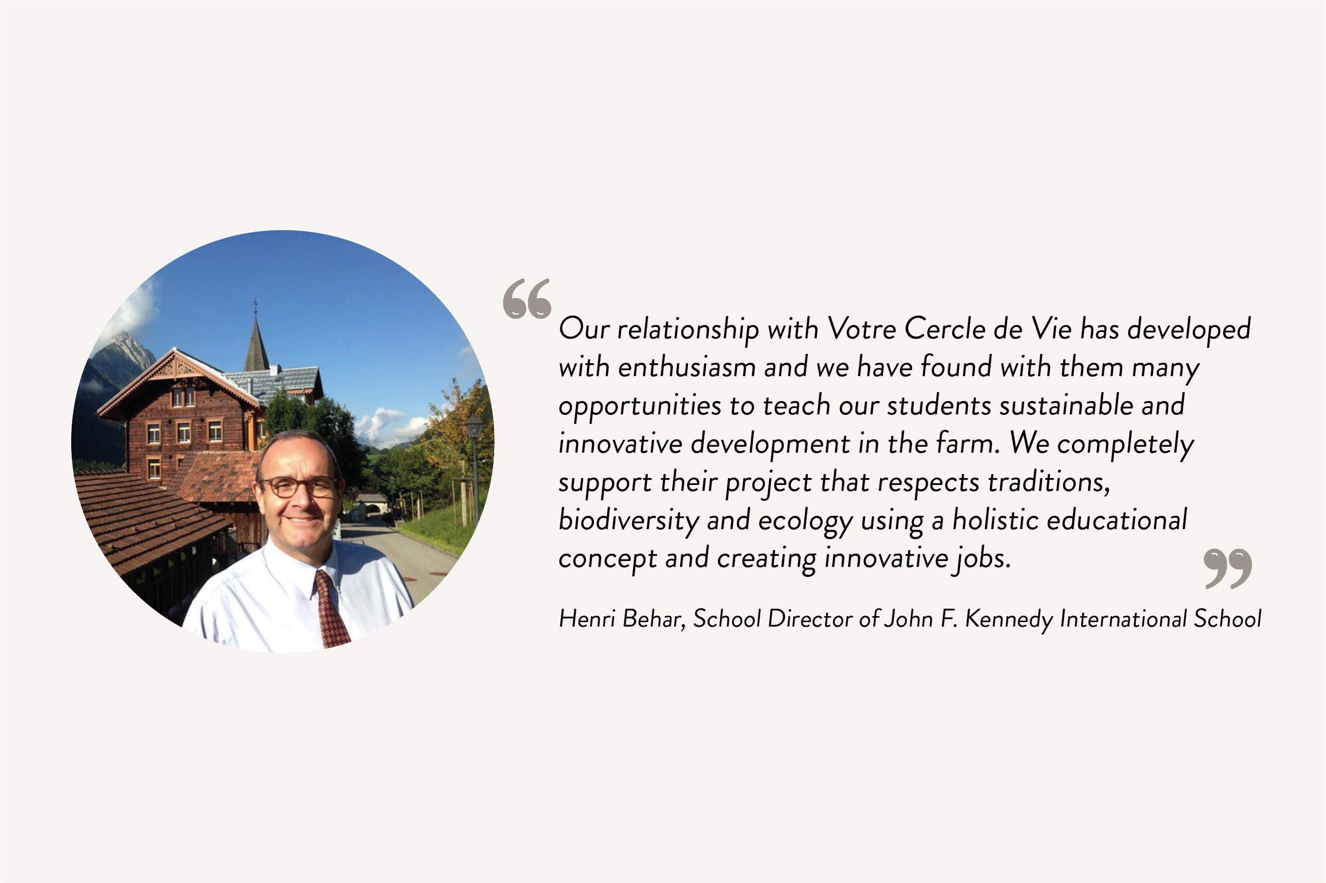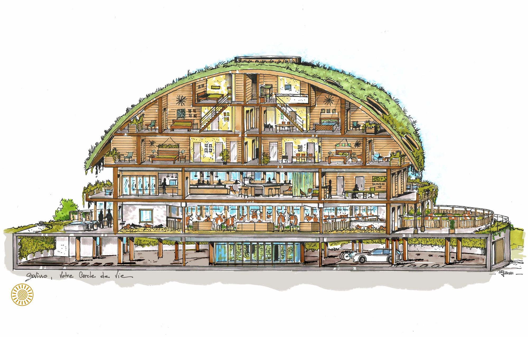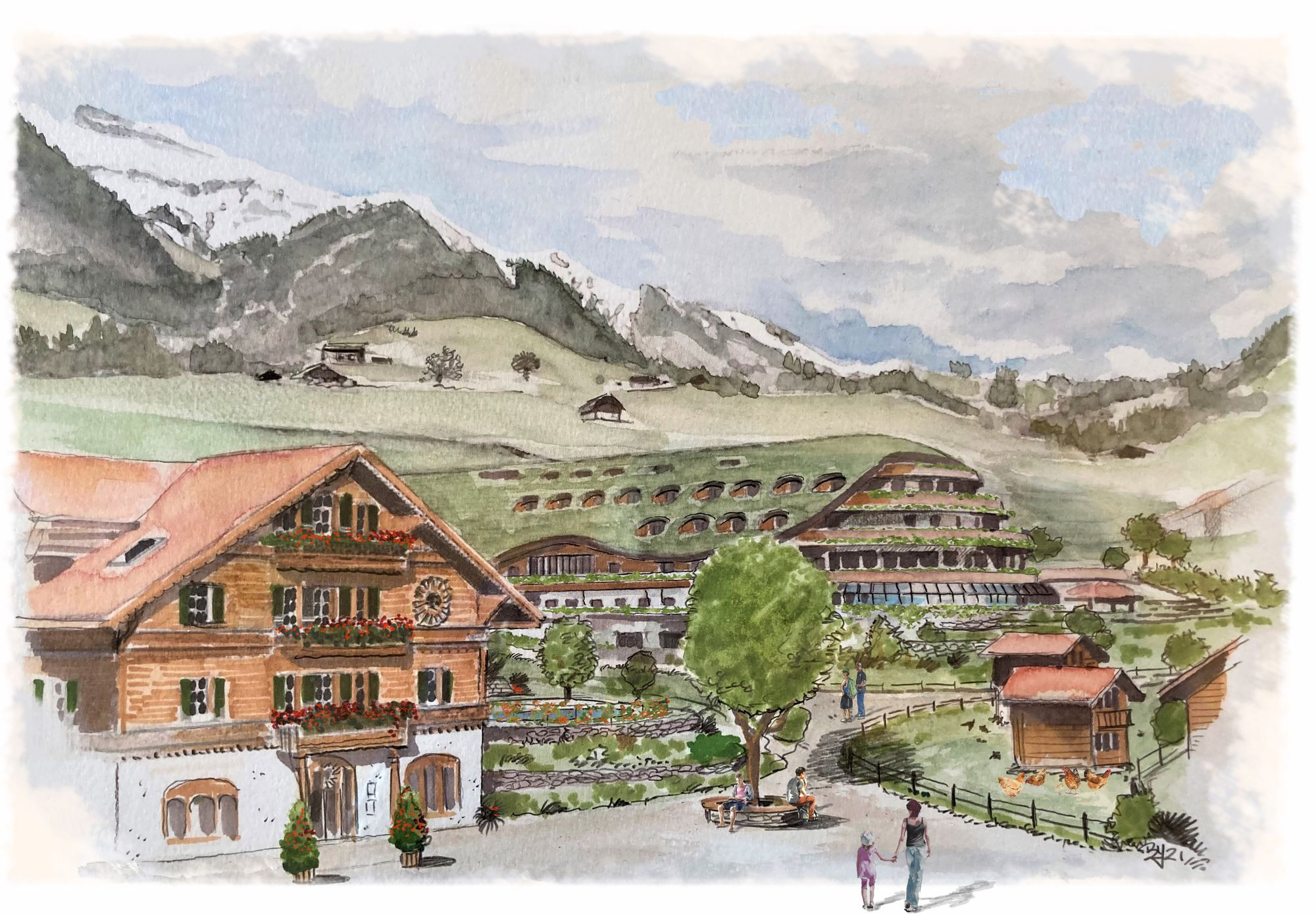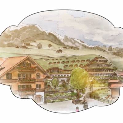 Die Einrichtung befindet sich im Zentrum des Dorfes Château-d’Oex, in mitten von 20 Hektaren landwirtschaftlicher Fläche. Es setzt sich aus zwei Gebäuden zusammen, welche von einem Park und von für bioökologische Gärten vorgesehene Zonen umgeben sind. Um die Harmonie unserer Landschaft zu bewahren, ist eine traditionelle und zugleich organisch architektonische Gestaltung erforderlich. Unsere Konzepte der Architektur sind inspiriert von Feng Shui und der von der Natur festgelegten Ordnung (heilige Geometrie): das „Bovino“ -Gebäude wird aus dem Hügel herauswachsen und vollständig mit ihm verschmelzen. Diese Mischung aus organischer Architektur (Gründächer) und dem traditionellen Pays-d'Enhaut-Stil (Fassaden mit kleinen Holzschindeln) passt perfekt in das Herz der Natur.