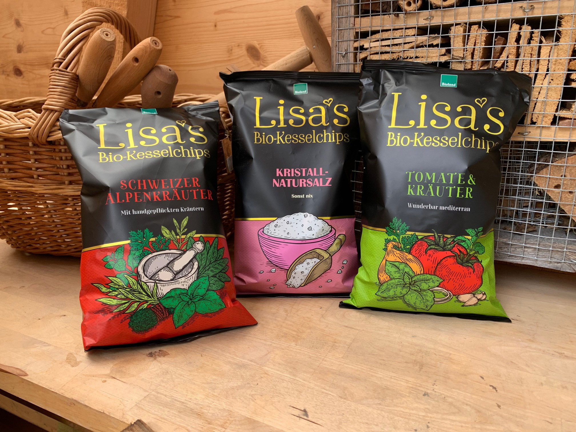 En mai, pour les amateurs de chips, nous vous offrons une réduction de 10% sur les chips « Lisa » dans les assortiments suivants : chips bio « Lisa » aux herbes des Alpes suisses, chips bio « Lisa » Sel naturel cristal et chips bio « Lisa » à la tomate et aux herbes.
