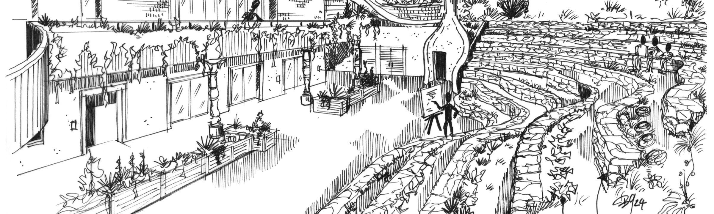 Cet amphithéâtre extérieur, composé de gradins avec des murs de pierres sèches en terrasse, offre une expérience immersive où la connexion à la nature est au cœur de chaque événement. Sur les gradins sont plantés des herbes aromatiques, plantes médicinales, des petites baies, des légumes et fleurs, pour la plupart des espèces rares ; c’est un endroit vivant riche en biodiversité !