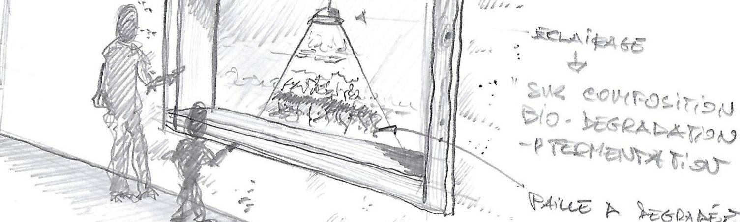 Je me présente : je suis le Lombricomposteur, un dispositif écologique, symbole du renouveau. Ma structure comprend plusieurs niveaux où les lombrics décomposent la matière fécale, dernière étape de la chaîne alimentaire. Les vers transforment cette ressource en compost riche en nutriments et mon système de filtration végétale purifie mon eau résiduelle, la rendant propre et réutilisable pour le bien-être des plantes de nos jardins et de notre toiture fleurie. Je suis en même temps à la fin et au début d’un nouveau cycle comme la mort appartient à la vie, je transforme les déchets en nouvelle ressource.