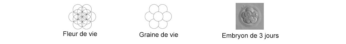 En comparant les 3 dessins ci-dessus, on peut observer pour la Fleur de Vie et l’embryon ont en commun un cercle principal qui se divise et se déploie de façon semblable à une division de cellules.